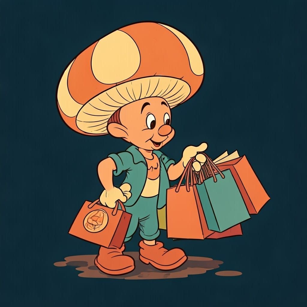 This charming image shows a mushroom in a vintage Disney-inspired setting, taking a trip to the market. The scene is filled with nostalgic charm and playful detail.