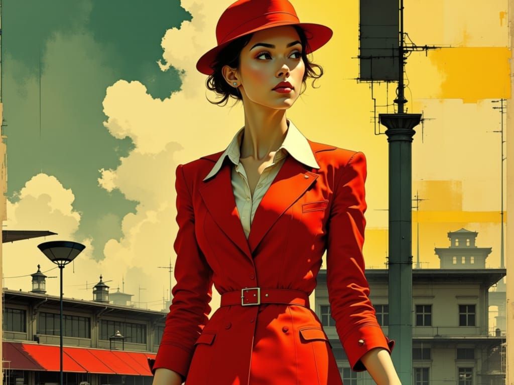 This image features a full body, highly detailed depiction of a Lebanese flight attendant, resembling Morgan Fairchild and Dichen Lachman, rendered in a dark oil paint aesthetic with vibrant red, amber, yellow, and teal accents.