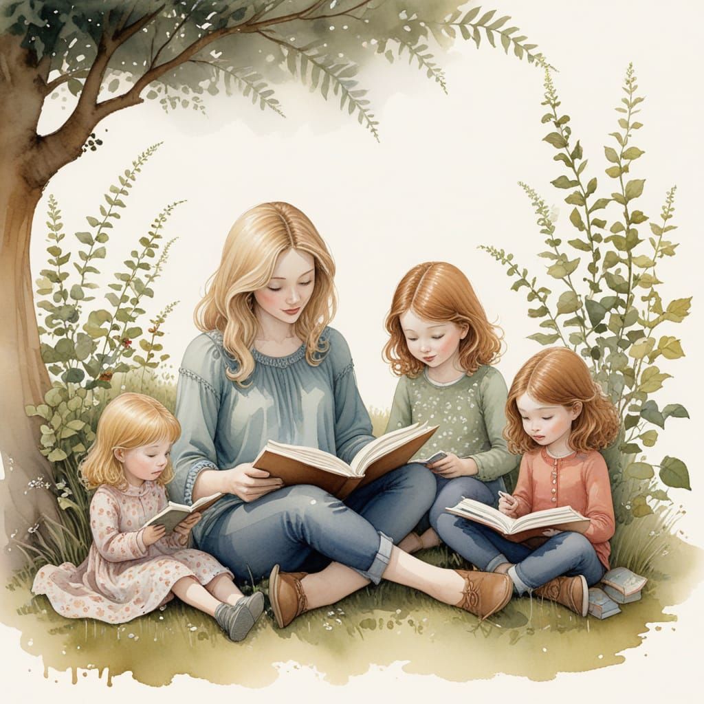 This watercolor illustration depicts a young mother surrounded by her children, reading together in a warm and intimate setting, reminiscent of classic children's book art.