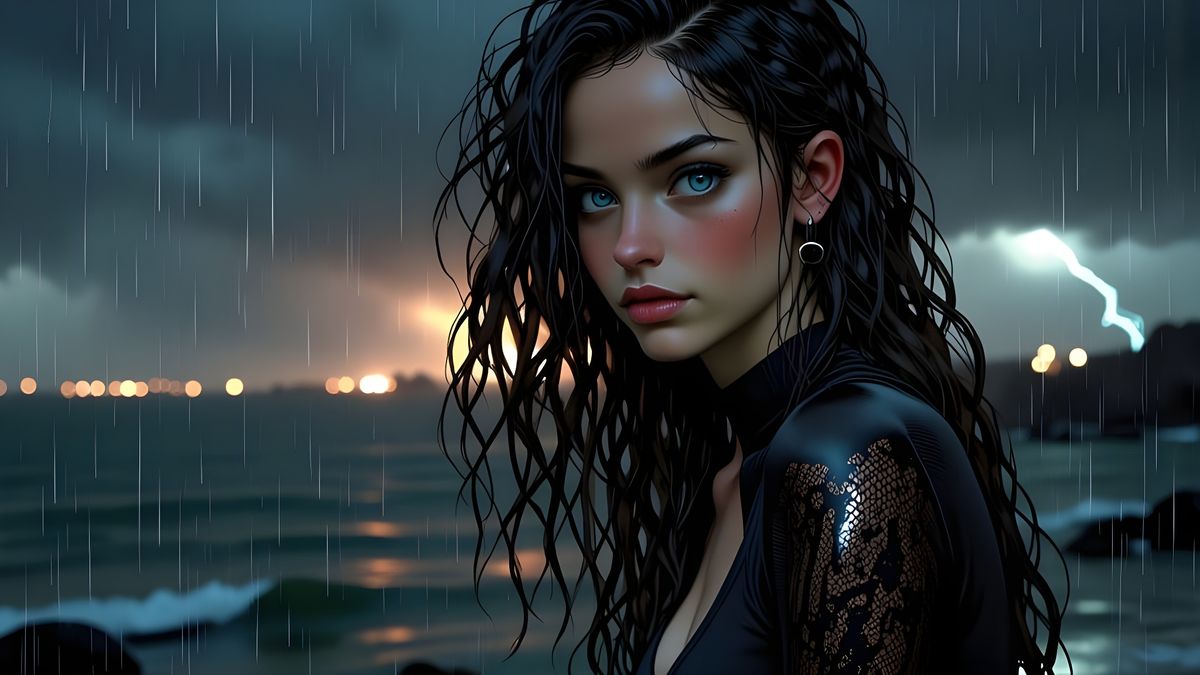 A striking picture of a woman in a diving suit smiling at the camera during a nighttime storm. This cinematic image features film grain, dramatic lighting, and a vignette effect.