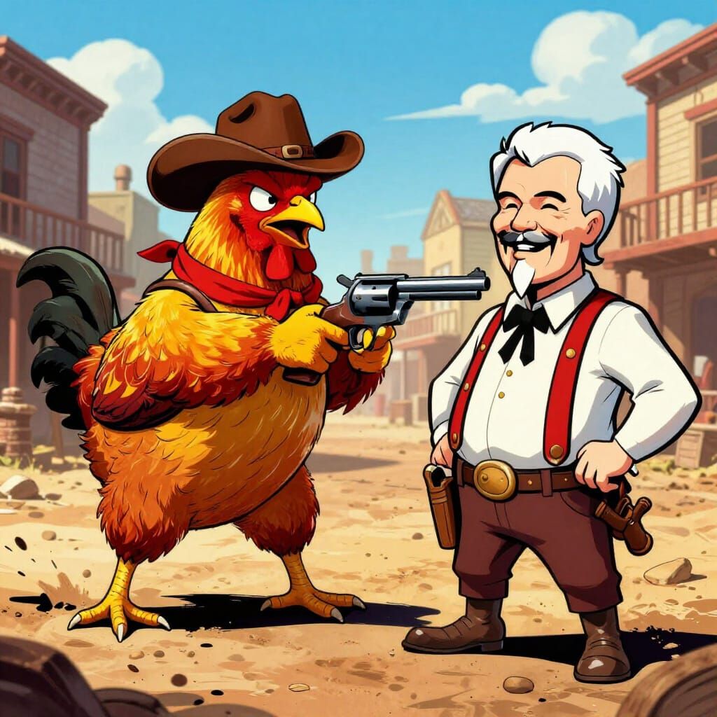 This image shows a stylized chicken in a cowboy hat pointing a gun at a Colonel Sanders caricature in a dusty town square. The art has dramatic lighting and bold comic book style.