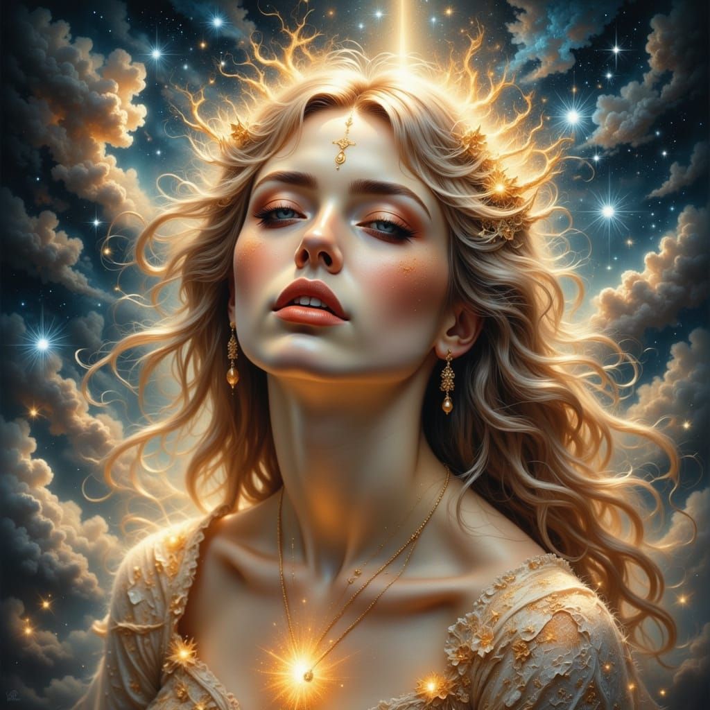 This image depicts a luminous celestial entity with a translucent form, radiating gentle light and a benevolent smile. Swirling nebulae and stars create a cosmic backdrop in a digital matte painting style.