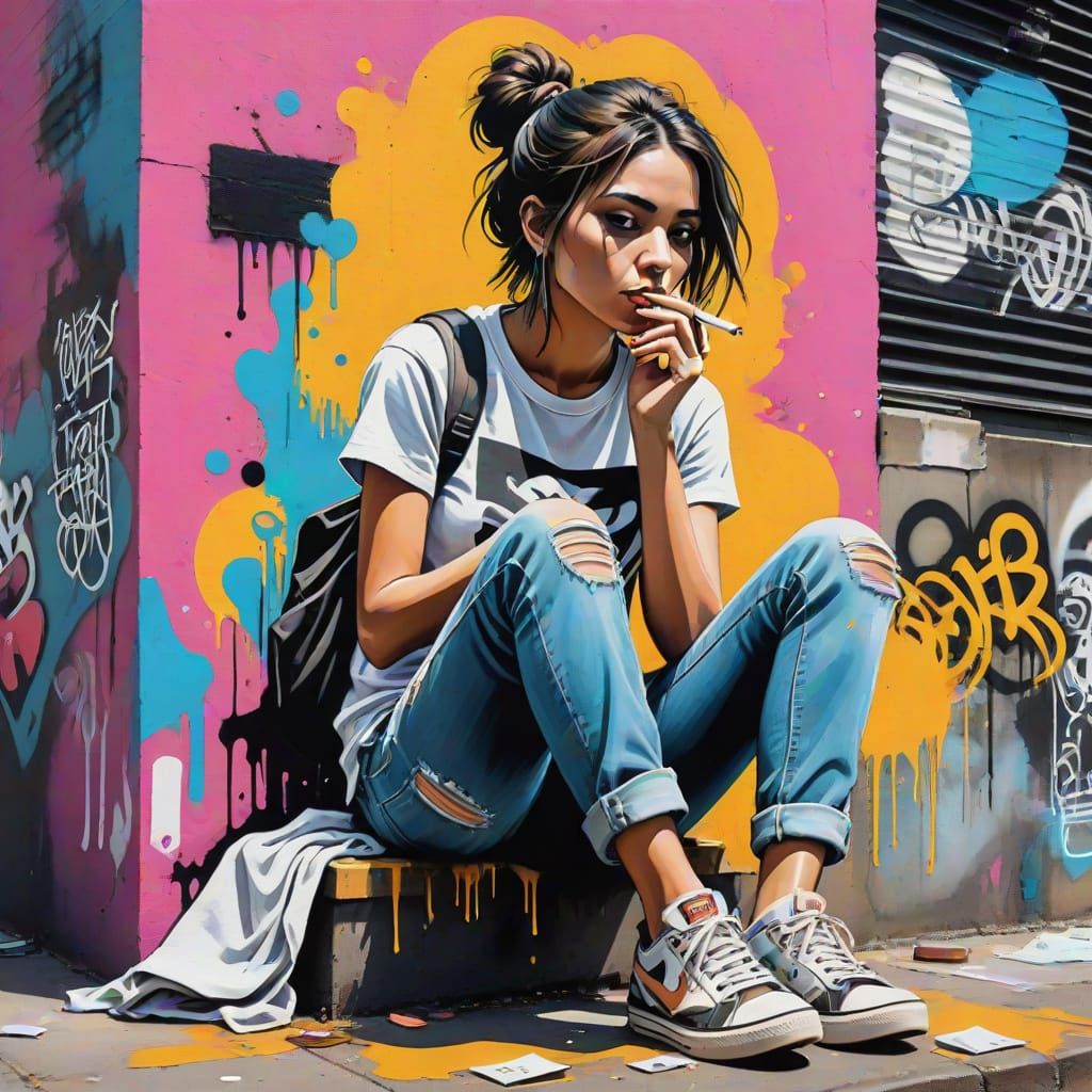 This image features a close-up of a girl with a bold, expressive style, inspired by urban murals and stencil art, with vibrant colors and high contrast.