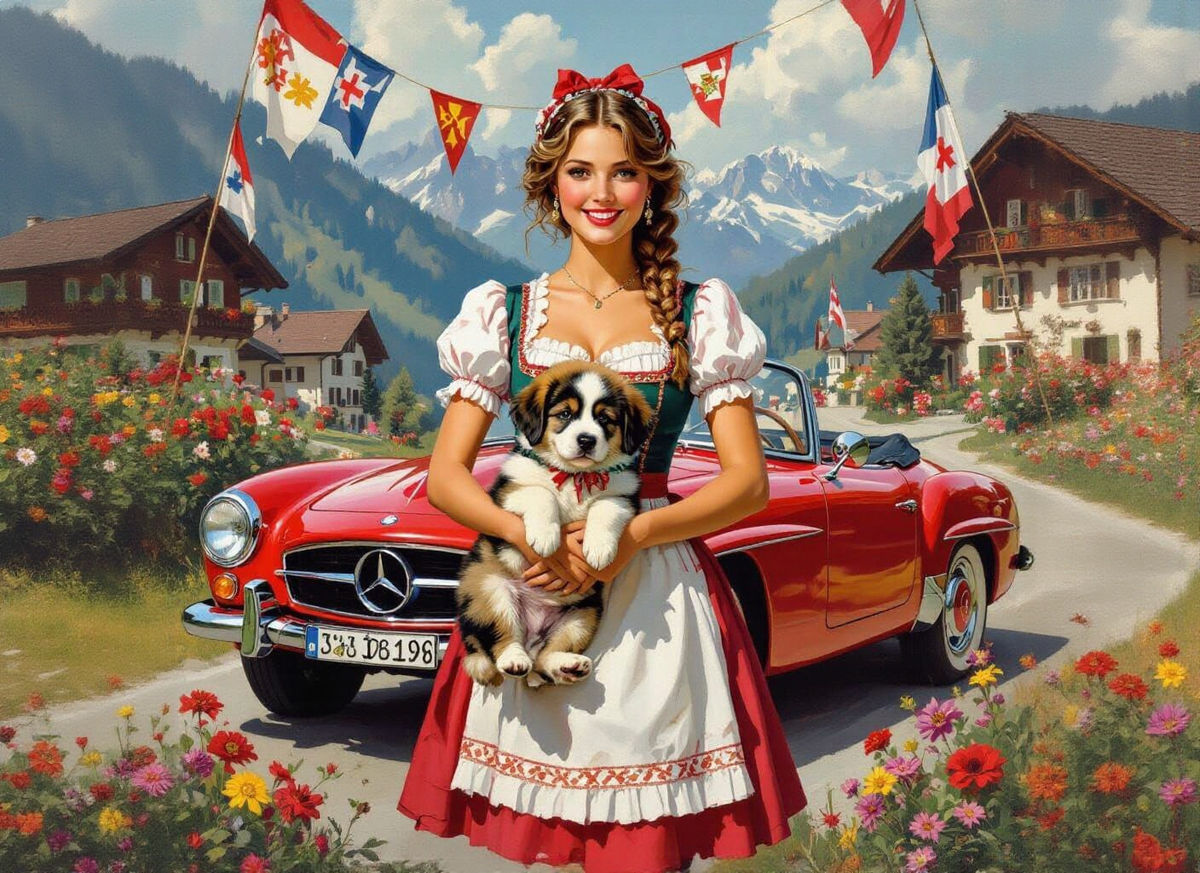 A beautiful German maid holds a Saint Bernard puppy at an Alpine festival, with a red Mercedes convertible. Rendered as a romantic, impressionistic oil painting.
