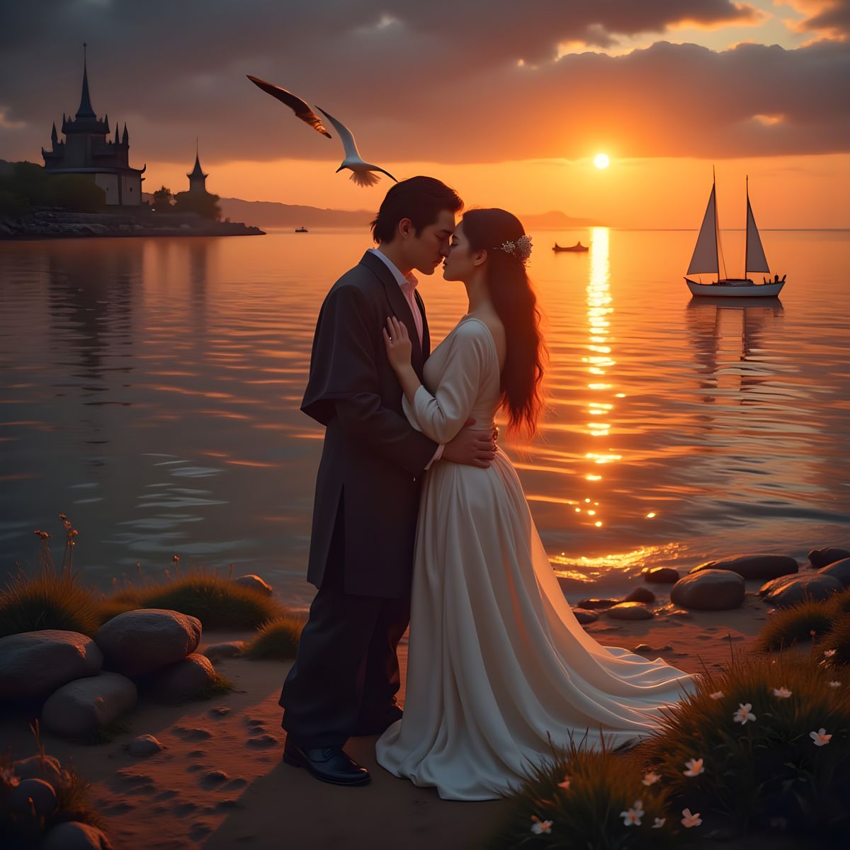 A breathtaking digital painting of a geisha in a romantic kiss, set against a stunning sunset over the bay, with intricate details and a cinematic atmosphere.