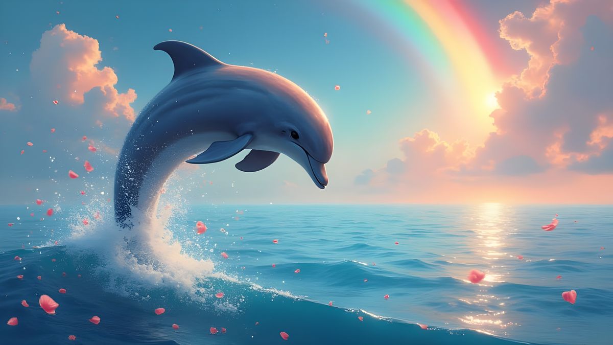 A vibrant image of a dolphin jumping from shimmering water. Rose petals, fairy dust, and a rainbow create a dreamy, ethereal atmosphere in a whimsical digital art style.
