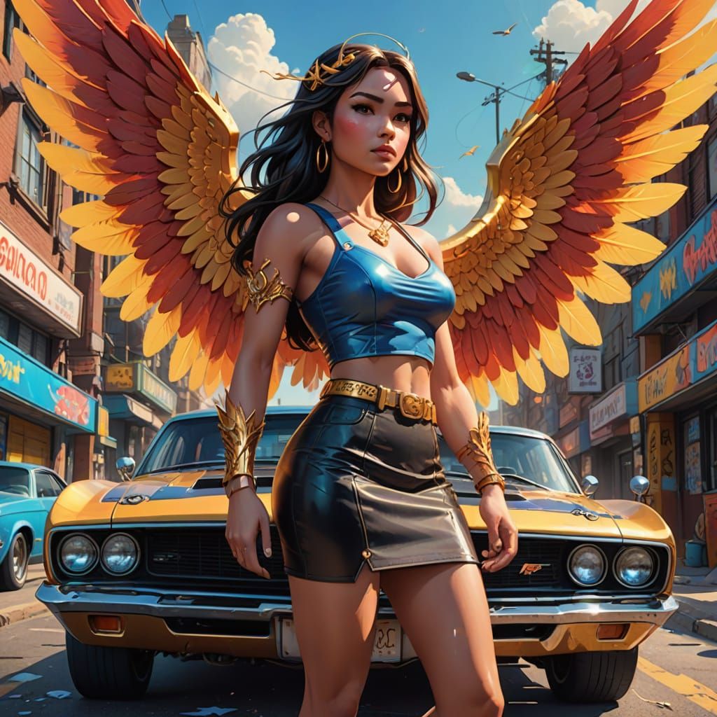 A stunning female angel poses with vibrant muscle cars in a dynamic comic book art style, with intricate details and a bold, high-contrast color palette inspired by Pixar and Disney concept art.