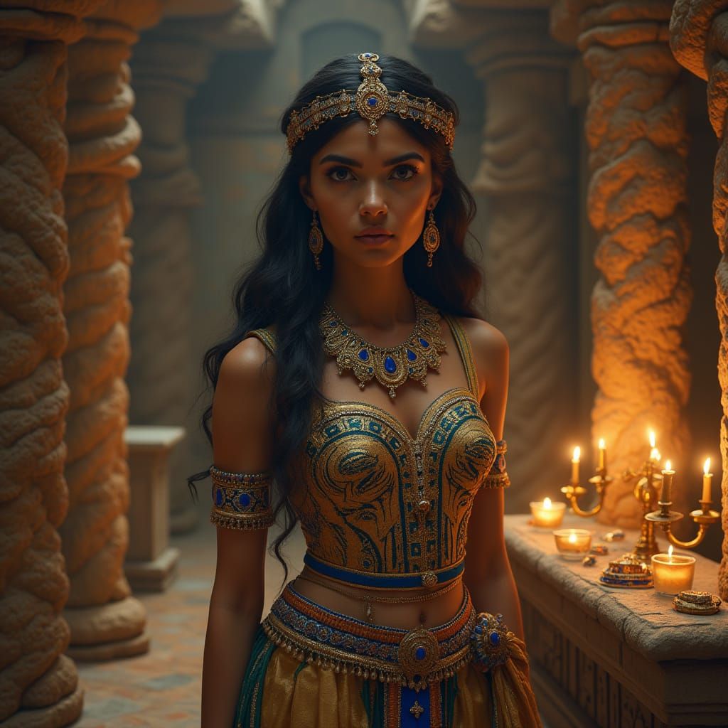 This image shows an Egyptian woman in traditional clothing and jewelry, standing in an underground temple filled with treasures. Soft, warm copper light illuminates the scene as hyperrealistic digital art.