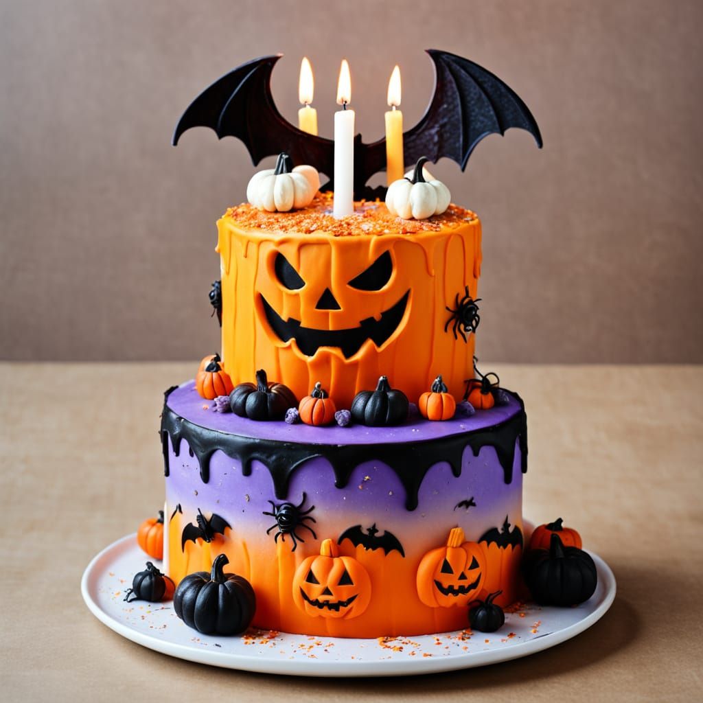 This image showcases a festive birthday cake adorned with Halloween themes, featuring pumpkin-shaped candles, bats, and spider accents for a spooky celebration.