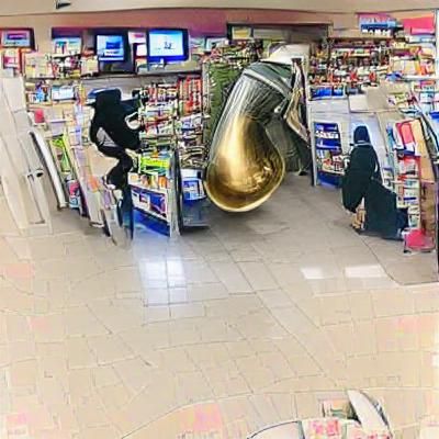 This image depicts a tuba committing a robbery in a store. The unusual scene is rendered with crisp clarity, highlighting the absurdity of the situation.