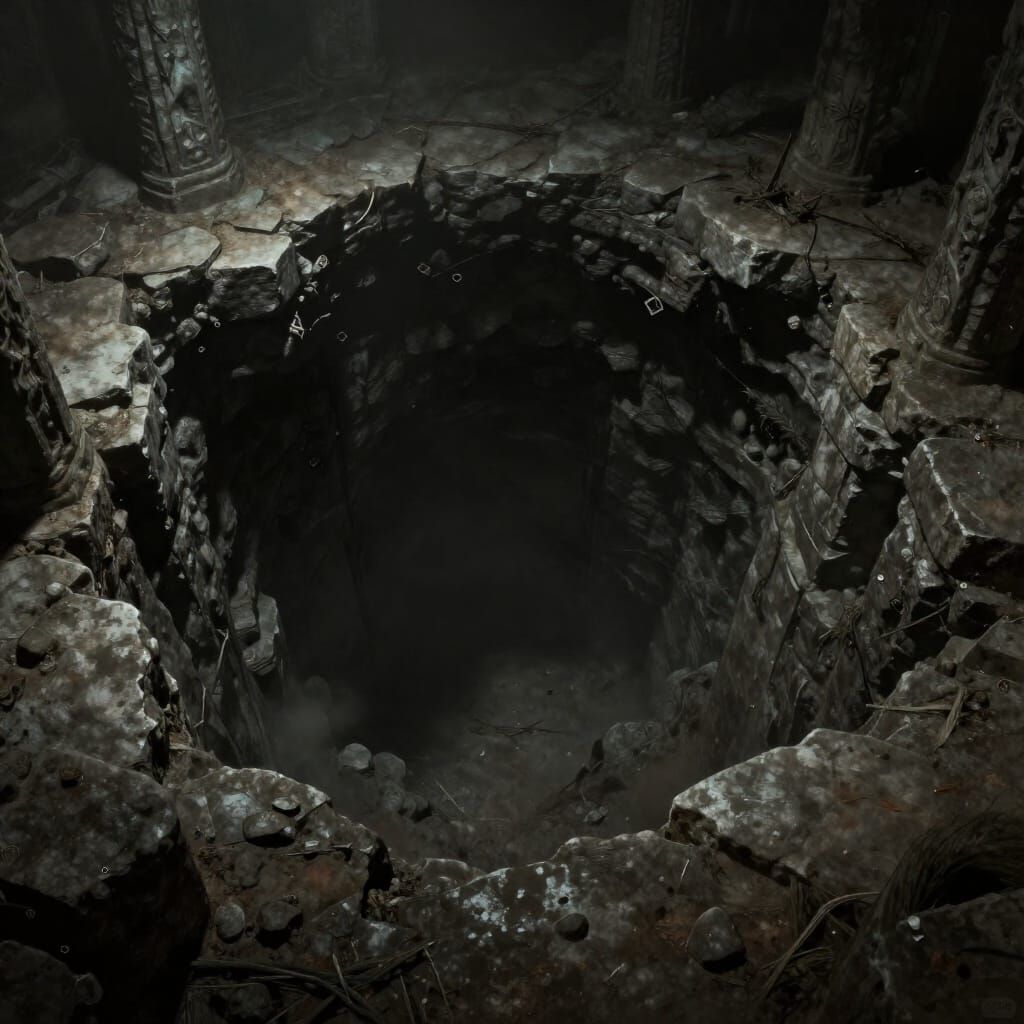 This image shows a dangerous, dark pit in an ancient stone tomb, created in a concept art style with dramatic lighting and a desaturated color palette, evoking dread and mystery.