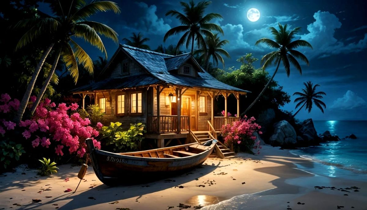 This image shows a fisherman's cottage on a Caribbean beach at night. A wooden rowboat sits on the shore, with bougainvillea, palm trees, and a bright moon illuminating this magical scene.