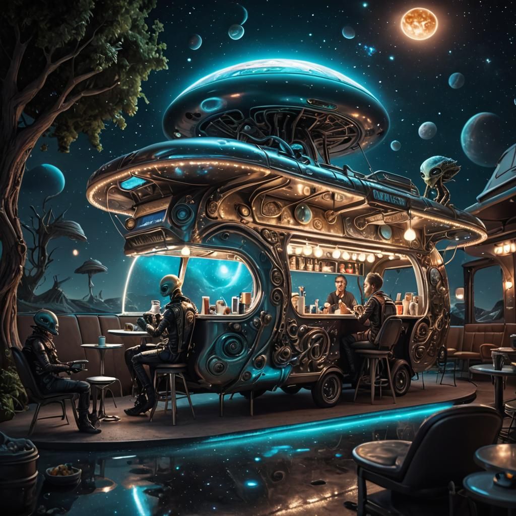 Aliens sipping coffee at a Floating rococo Mobile Coffee shop space Trailer parked in the cosmic galaxy :: selling cosmic Espresso, Latte, flat white, cappuccino, mocha, :: Hyperrealistic, splash art, concept art, long shot, side lighting, intricately detailed, color depth, dramatic, :: steampunk aliens ...