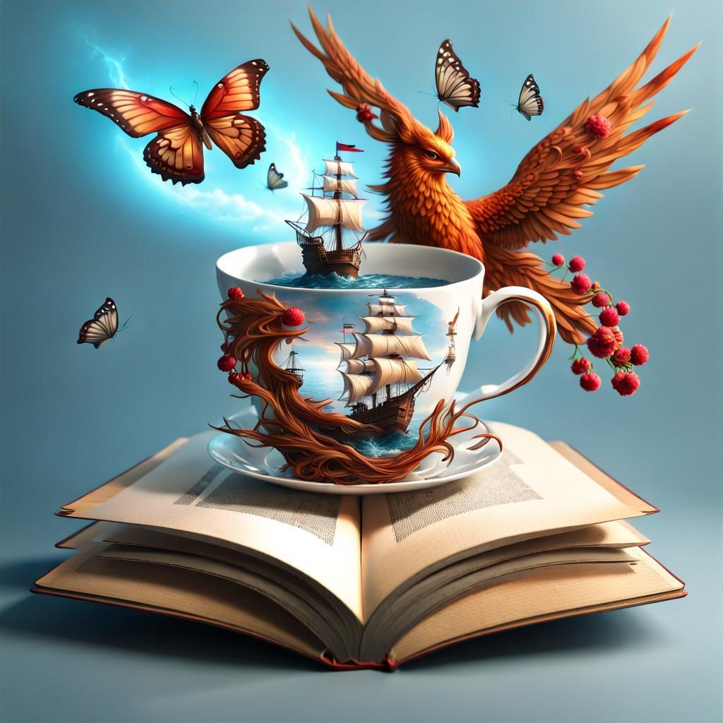 A digital painting of a phoenix bird with butterfly wings emerging from a teacup. The teacup sits atop a book lighthouse surrounded by ocean waves, a pirate ship, and other surreal elements in a maximalist style.