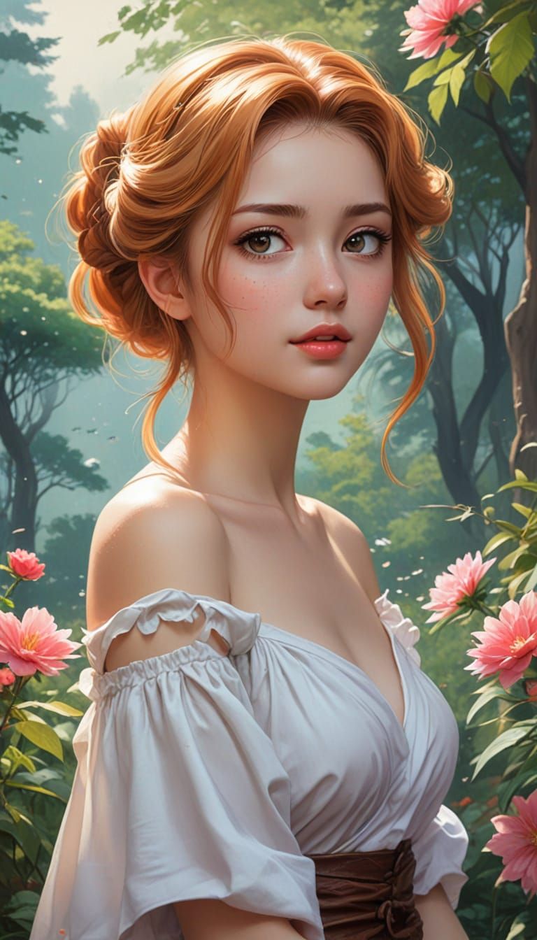 This enchanting image is a beautiful representation of fantasy and anime elements, set in a dreamy atmosphere reminiscent of oil painting techniques.
