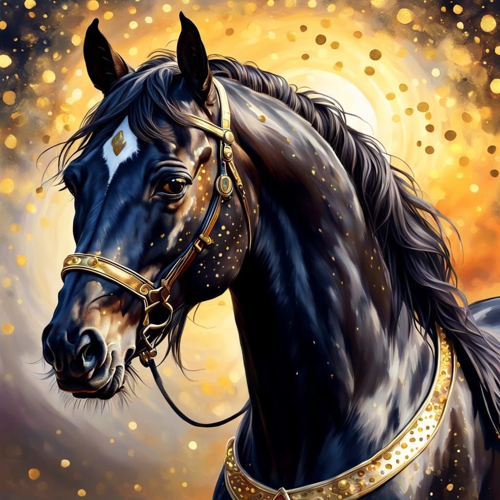 A close-up digital painting of a black horse adorned with gold polka dots, set against a warm sunset. The artwork features a vibrant oil painting style and shimmering details.