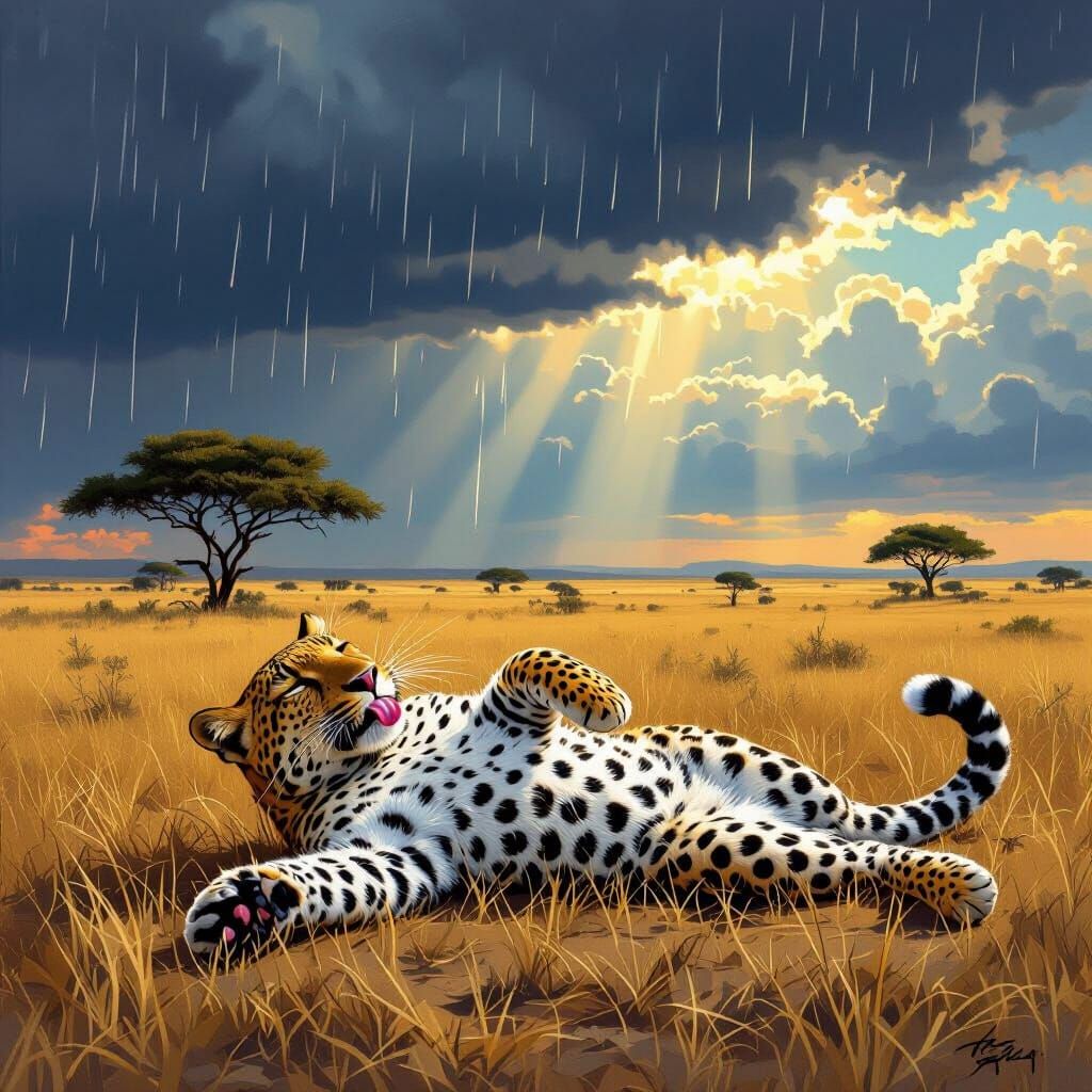 A striking picture of a leopard playfully lying on its back in a dry savanna. The artwork features dramatic rain clouds with sunrays, rendered with atmospheric lighting and vibrant colors.
