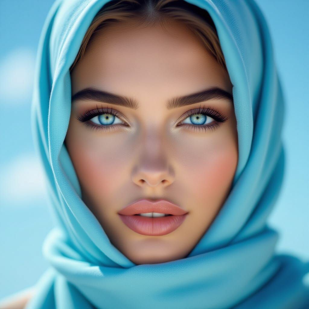 A close-up portrait of a beautiful woman with striking blue eyes. She wears a sky blue scarf, set against a soft, complementary background generated by AI.