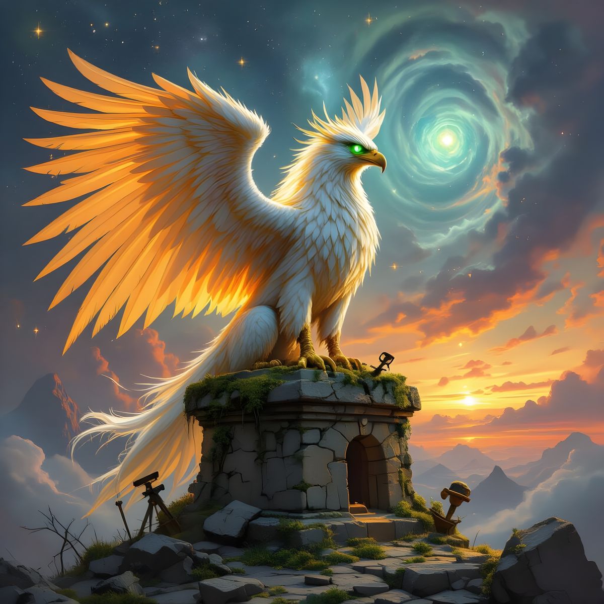 A powerful griffin with golden feathers and emerald eyes rests on a ruined observatory, set against a vibrant, star-filled nebula. Detailed fantasy concept art.