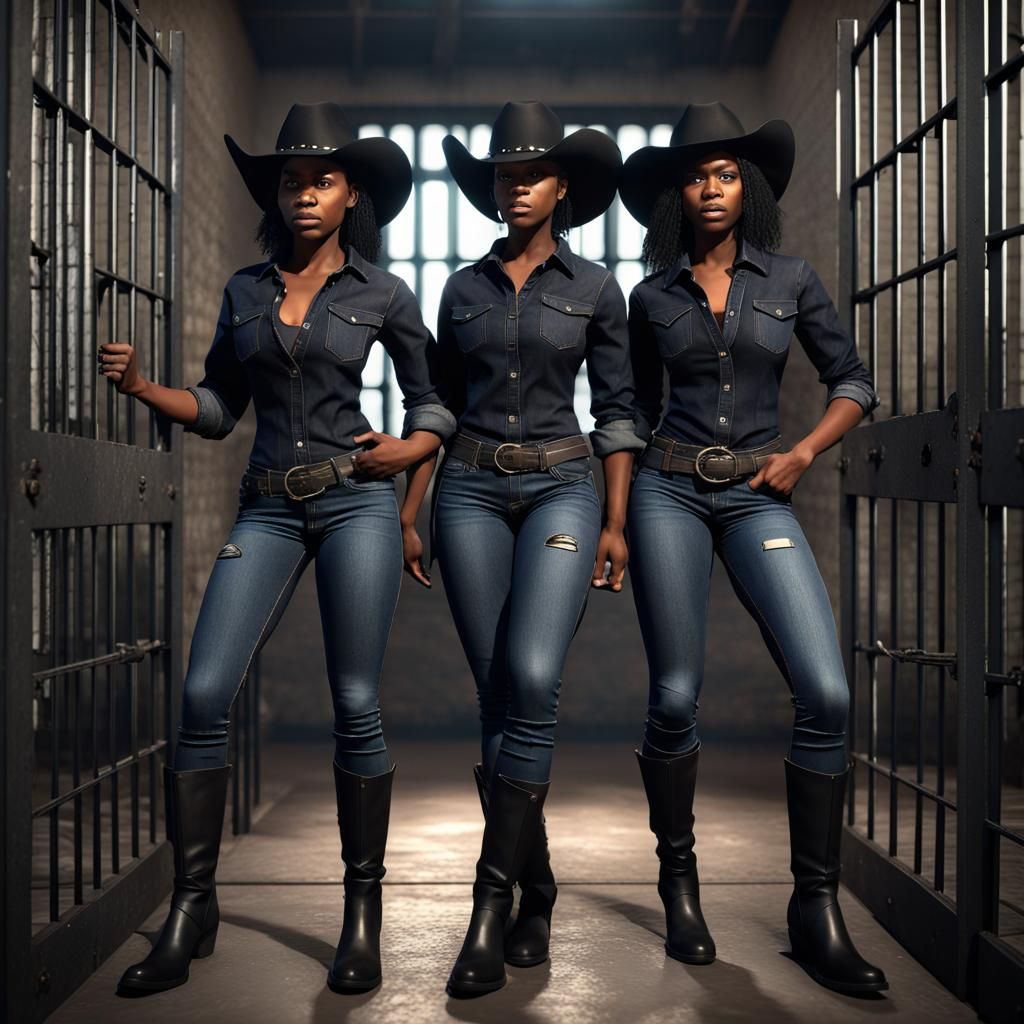 This image shows two Black women in denim shirts, jeans, and cowboy hats striking angry poses in a jail. The scene is rendered with the intricate details of a 3D game cinematic.