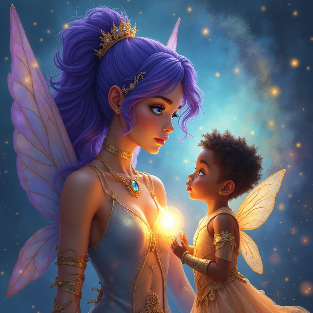 This image depicts a mystical fairy woman with vibrant purple hair and shimmering iridescent wings, gazing into the distance with a deep sense of longing. She's connected to a young boy clad in golden light armor, radiating innocence and wonder, in a cosmic dance of eternal love.