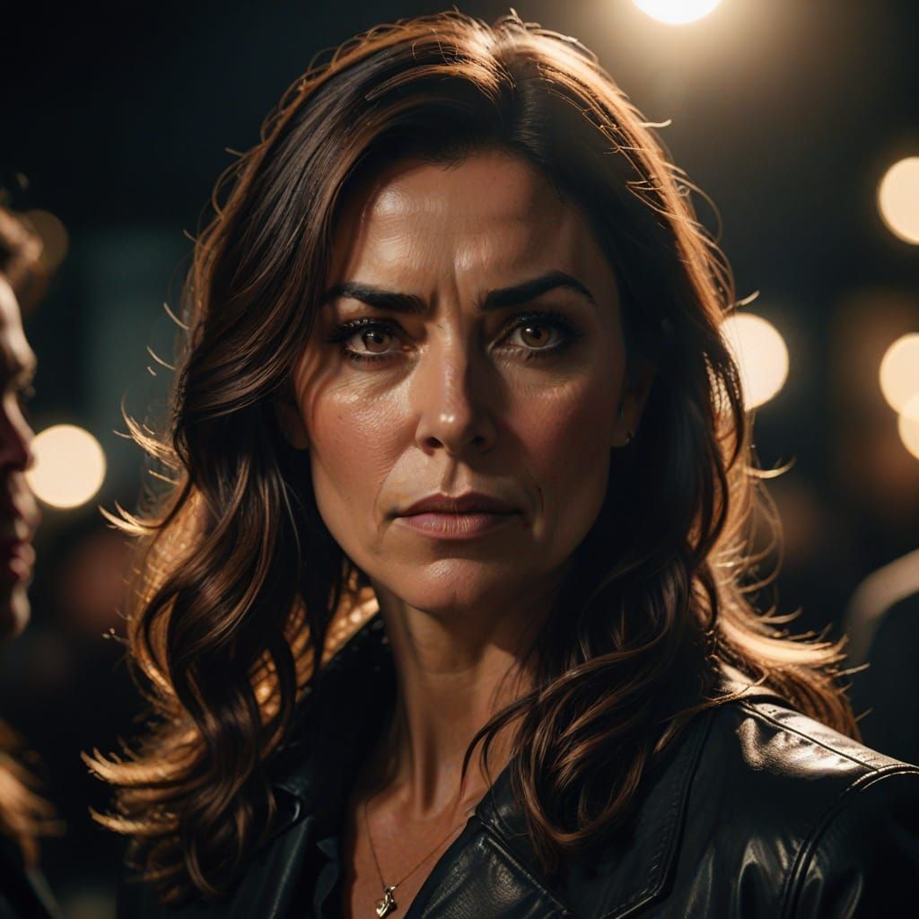 This image captures a medium shot of a 43-year-old Cypriote-American female reality TV presenter. Shot in a dramatic cinematic style with intense backlighting, it accentuates her determined expression.