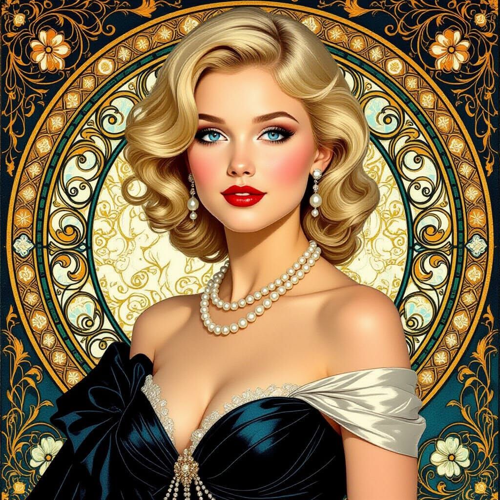 This image shows a fair-haired woman with striking blue eyes, adorned in an opulent dress, heels, and pearls. The artwork is reminiscent of art nouveau aesthetics.