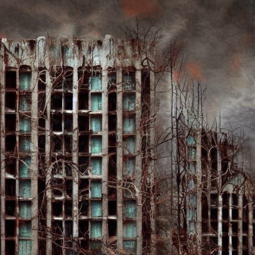 This image shows a post-apocalyptic wasteland with radioactive subhumans amid decaying ruins. Twisted vines and glowing mushrooms punctuate the desolate landscape in green and orange hues, rendered as dark surrealist digital art.