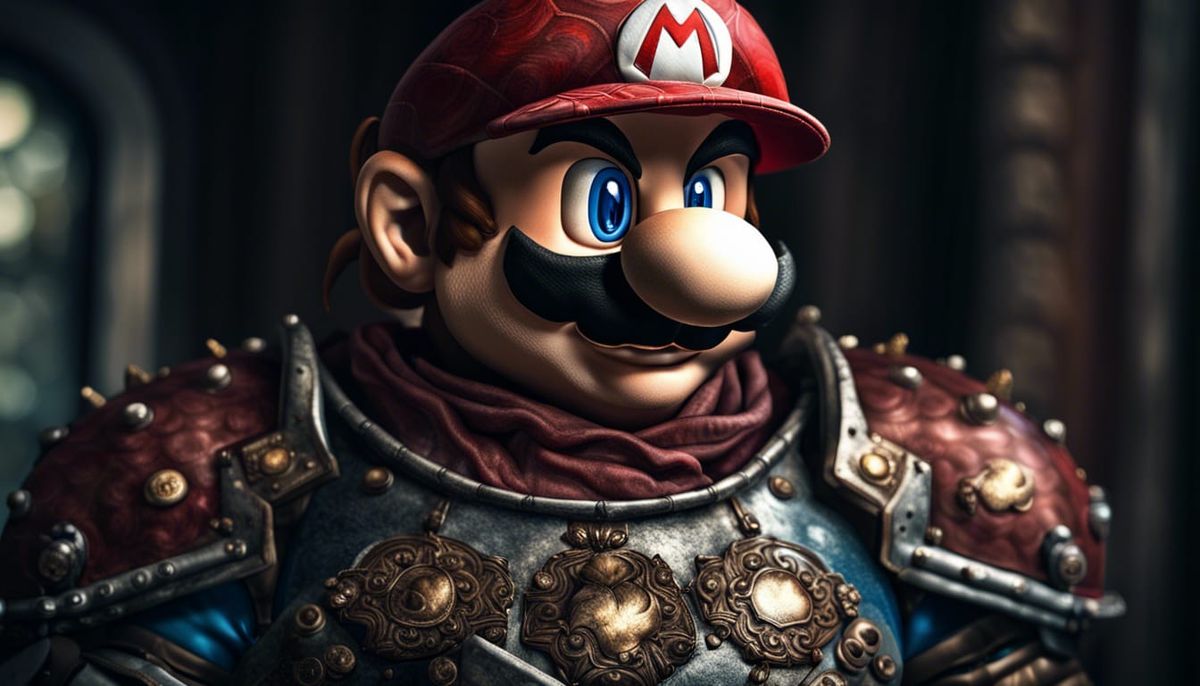 This image depicts a hyperrealistic rendering of Mario clad in detailed plate armor. The composition features high contrast and cinematic, atmospheric lighting.
