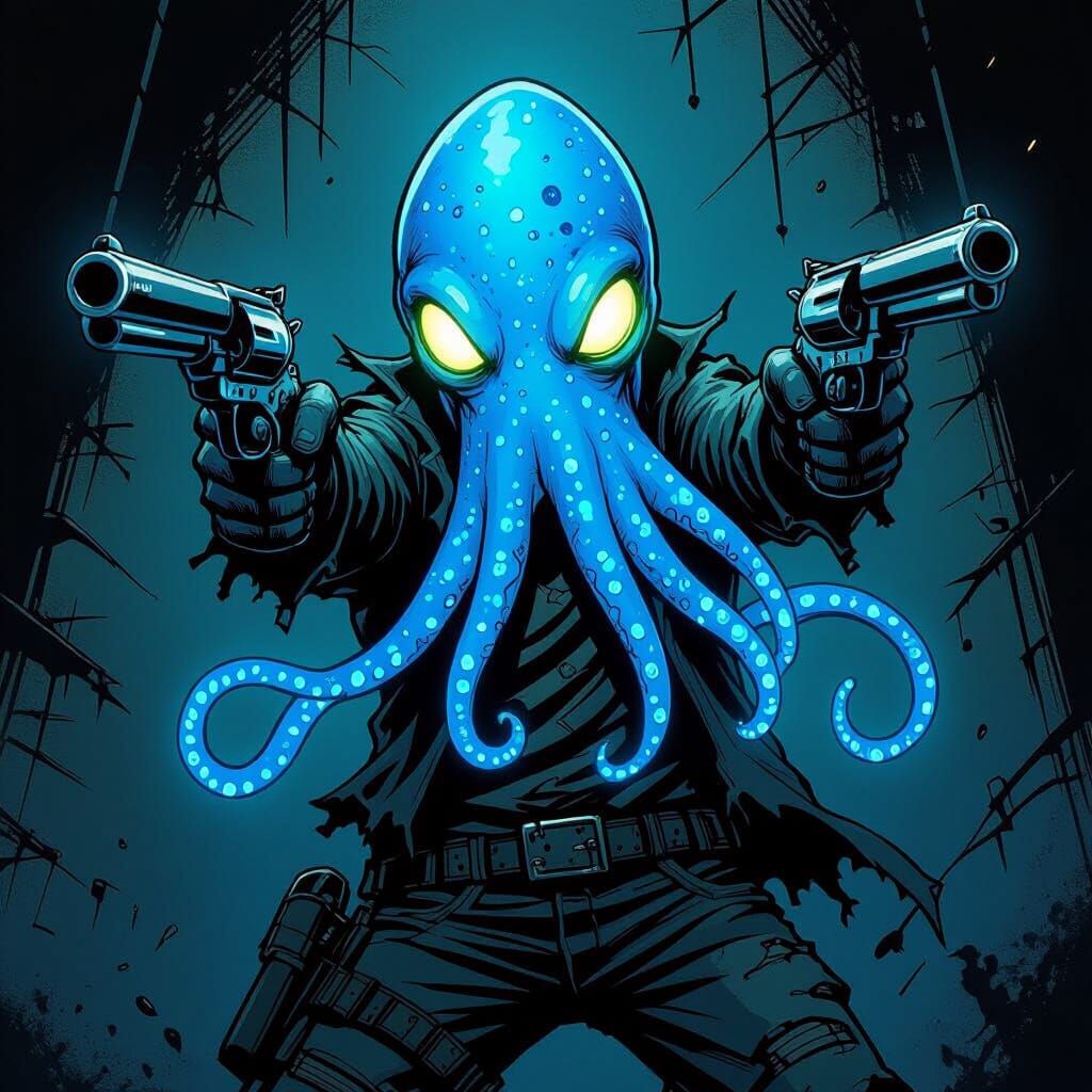 This image shows a humanoid squid in tattered prisoner clothes, holding two chrome revolvers. It's depicted in a dark, gritty comic book style with dramatic lighting and saturated colors.