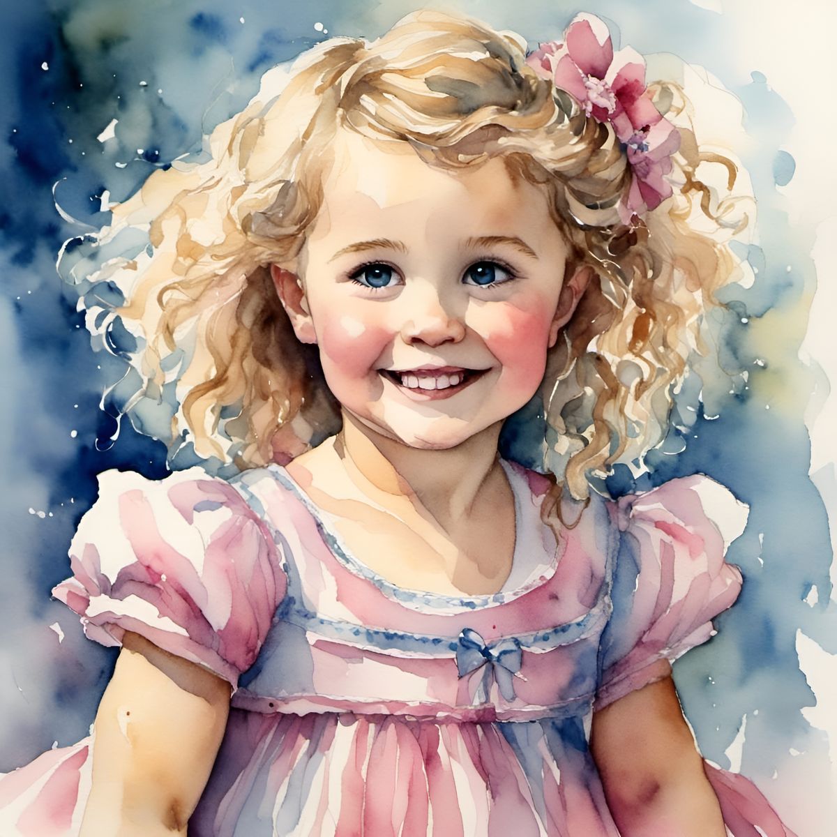 A watercolor-style image of a baby girl. She is smiling and has blonde, curly hair, blue eyes, and is wearing a pink dress. The artwork is soft and delicate.