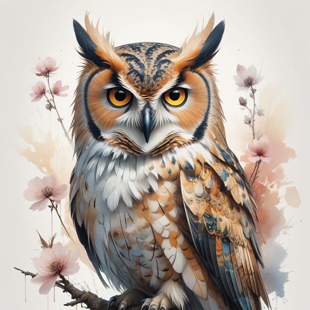 This enchanting artwork blends traditional craft with modern abstraction, featuring a wise owl perched silently in a misty glen at dawn. Delicate pastel hues and vibrant accents come together in a harmonious interplay of chaotic beauty and refined expression, set against a pristine white backdrop.