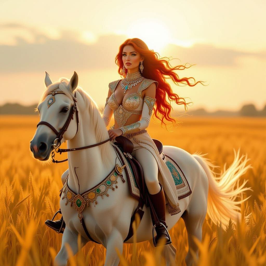 This image shows Rati, a beautiful red-haired goddess, riding a white horse through a golden field. The digital painting is rendered with triadic colors and volumetric lighting, in a hyper-detailed style.
