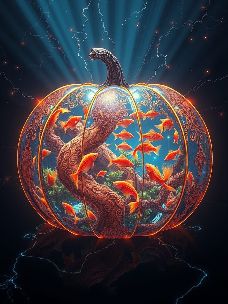 A surreal, glowing crystal aquarium shaped like a pumpkin vine, filled with iridescent fish and fractal light rays, in a high-contrast, bioluminescent style.