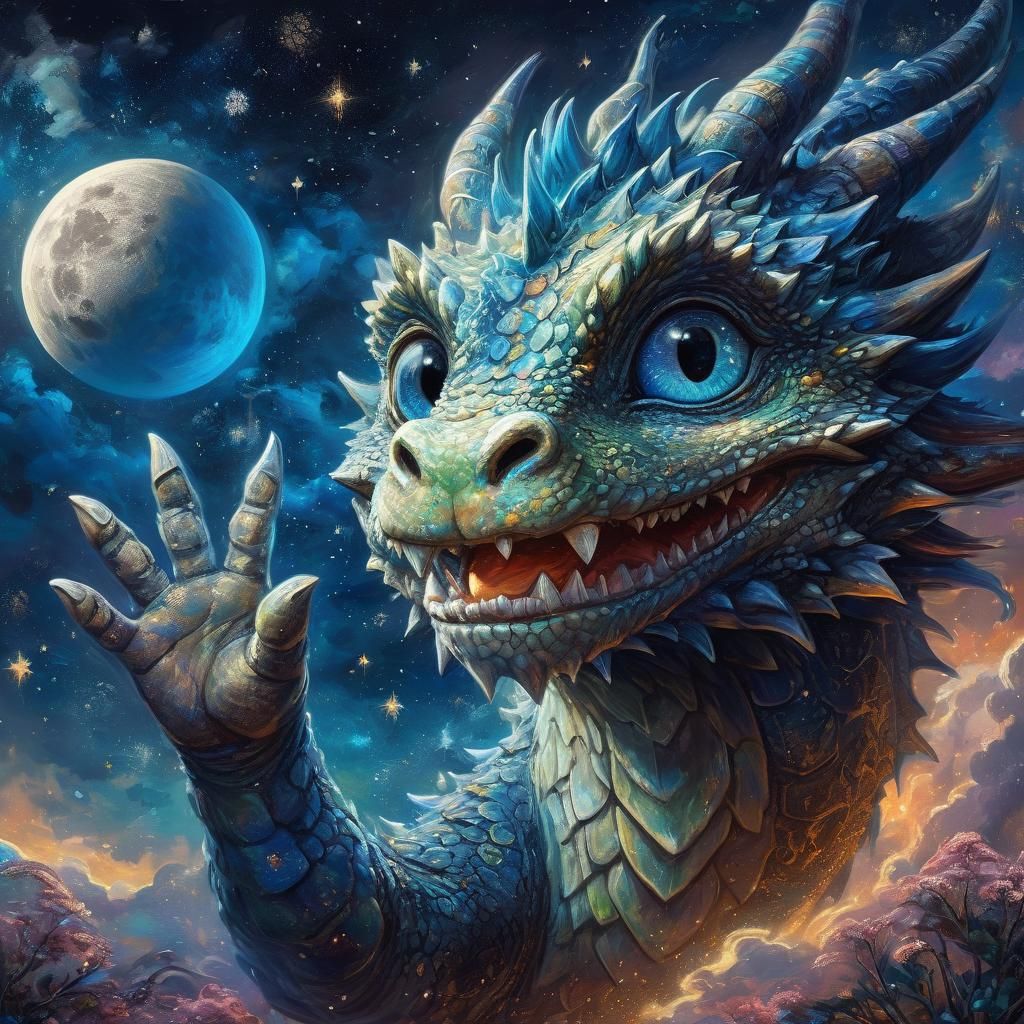 A charming dragon portrait set against a cosmic backdrop. The artwork features visible brushstrokes and vibrant colors reminiscent of an oil painting, with surreal elements and volumetric lighting.