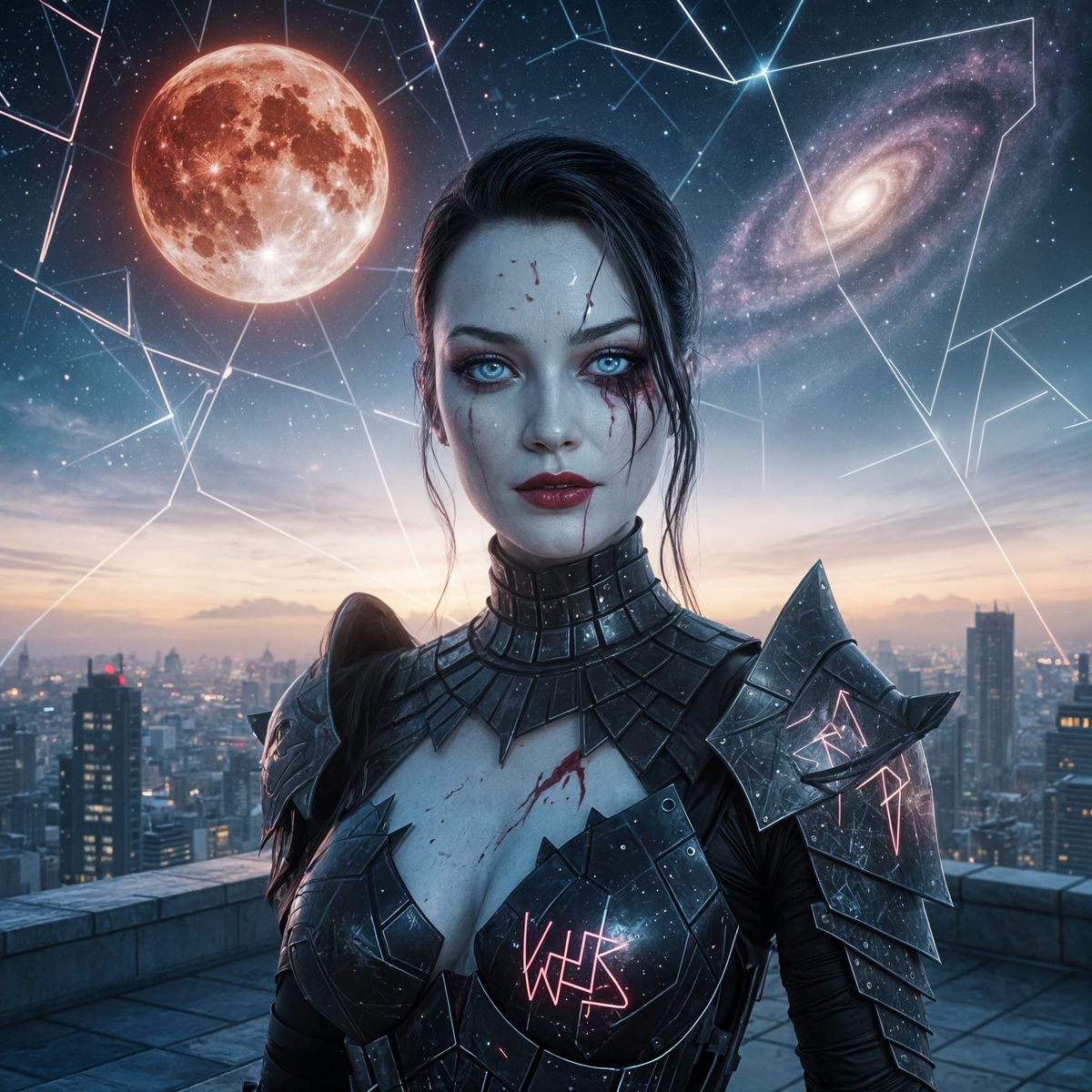 This image features a hyper-realistic yet surreal portrait of a female warrior on a rooftop amidst a cosmic storm. Her armor glows, and her doll-like face has striking makeup and icy blue eyes.
