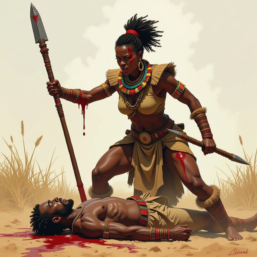 This image shows a fierce African queen in tribal armor, victorious over her foe. The vibrant digital art features gritty textures and intense emotion, depicting a dramatic battle scene.