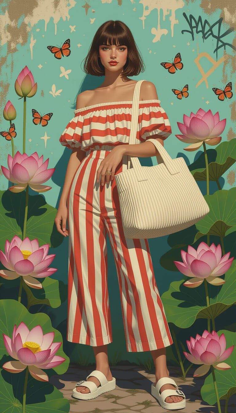 A CG-inspired image portrays a fairy in 90s alternative style. She wears a horizontally striped satin dress and corduroy pants, carrying a large purse among lotus flowers and butterflies. Graffiti elements add contrast.