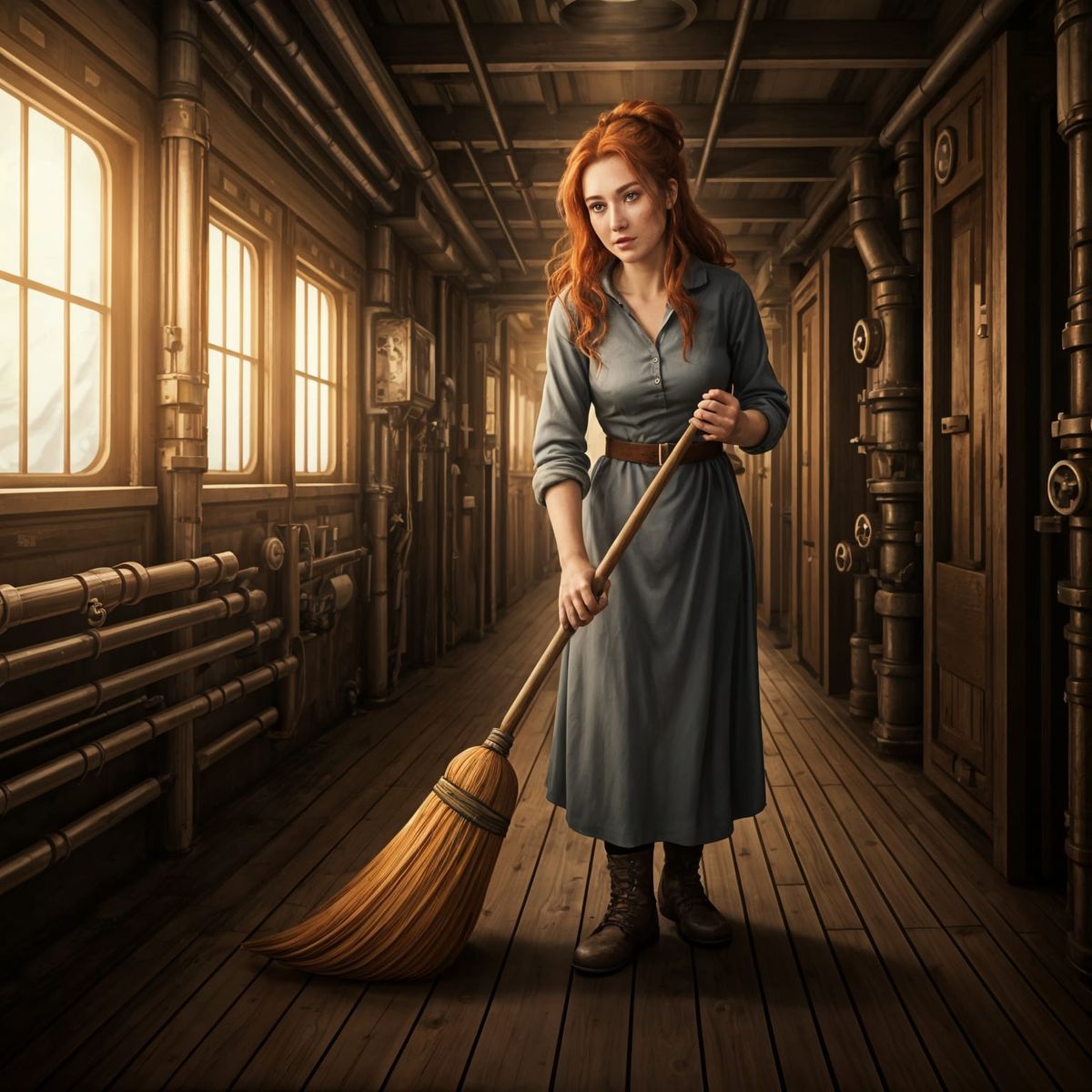 A middle-aged woman with long red hair, freckles, and green eyes. She wears a gray work dress and sturdy boots, with a locket around her neck.