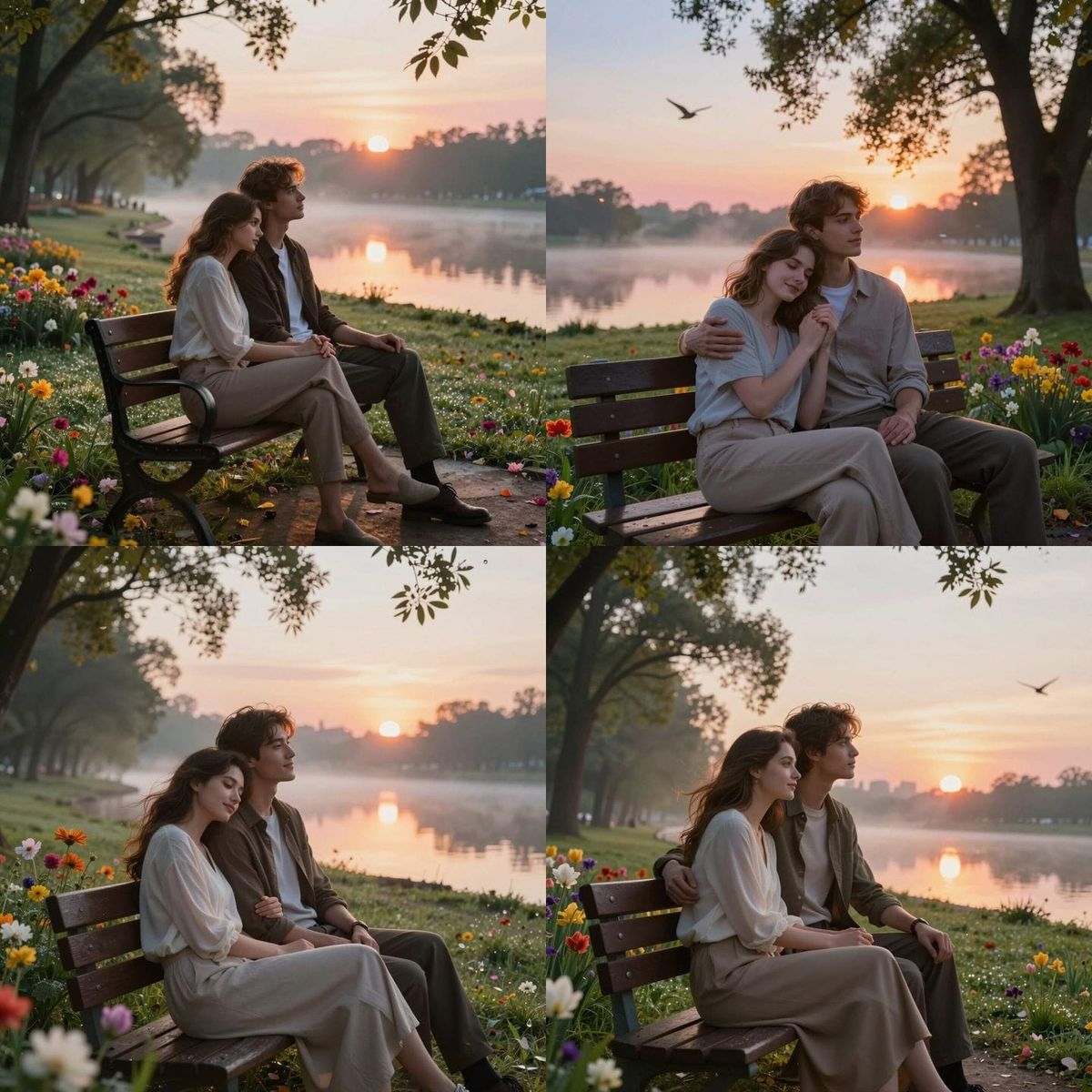 This image showcases a realistic, cinematic photograph of a young couple sharing a tender moment on a flower-adorned bench at sunrise in a serene park. The warm light highlights their natural affection and the tranquil beauty of the morning.