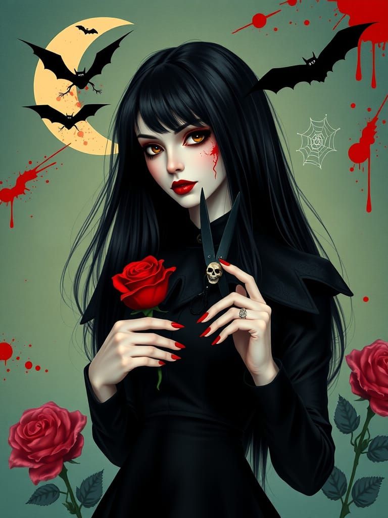 A stylized portrait of Morticia Addams trimming a rose with shears. The artwork blends realistic portraiture with macabre fantasy elements in a gothic aesthetic.
