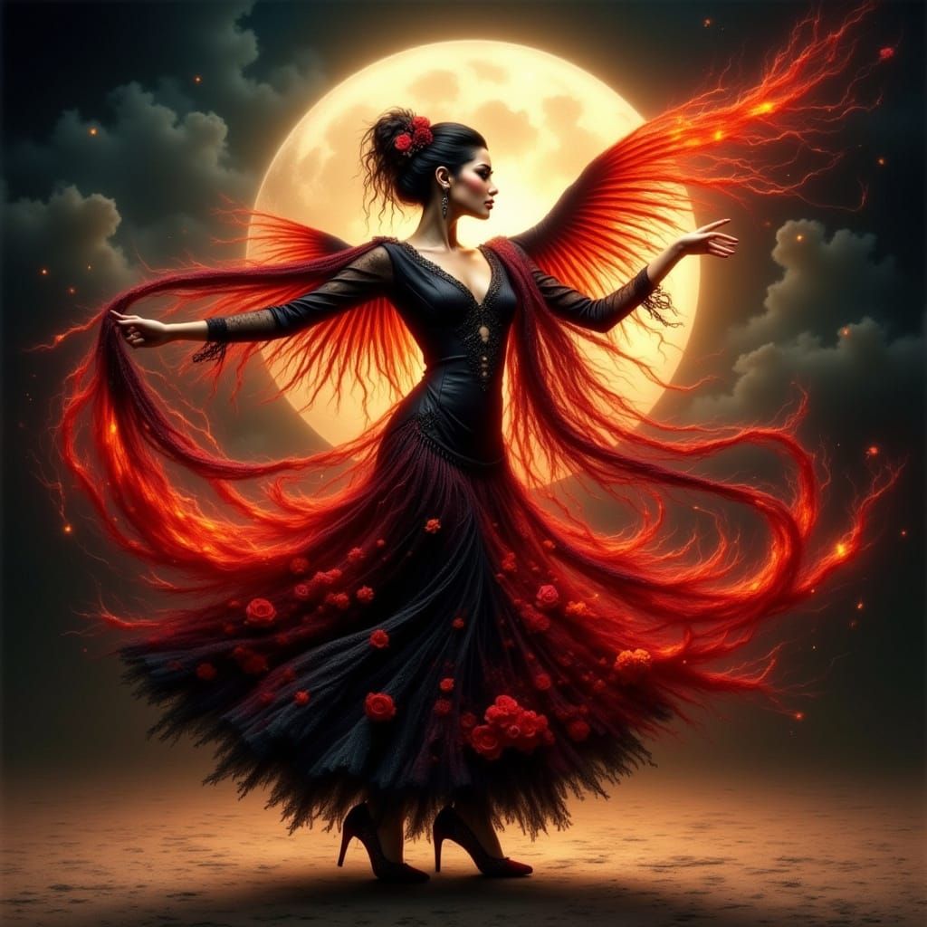 An attractive Hispanic female flamenco dancer dancing in the moonlight.She is wearing silver pumps and a long black and red dress, turning her into a living embodiment of a phoenix—a goddess of fire, strength, and rebirth.