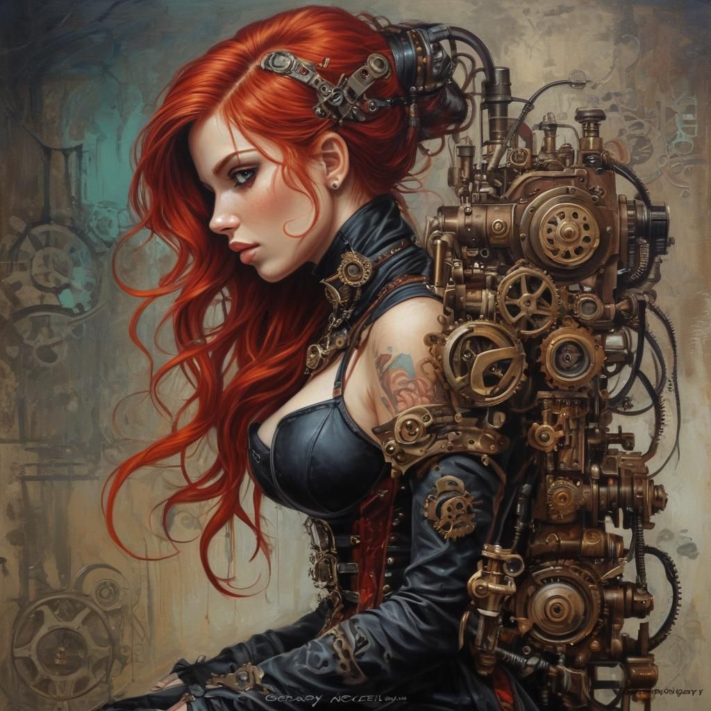 This image depicts a striking red-haired woman juxtaposed with a steampunk engine. The artwork showcases elements of graffiti and splash art, rendered with acrylics in a high-contrast, colorful style.