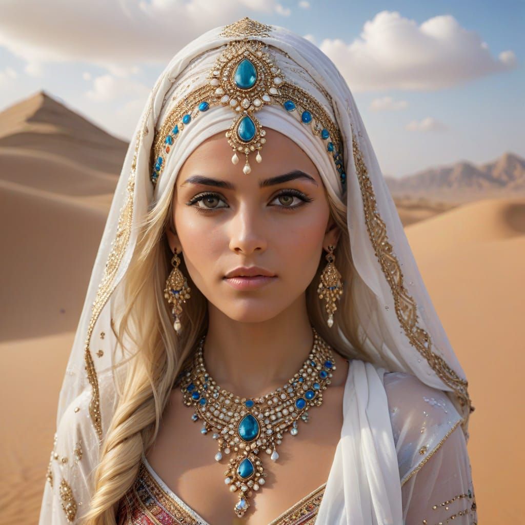 This image shows a stunning Middle Eastern woman wearing a lavish head dress adorned with gemstones, veils, and beads, with a serene desert landscape and a traditional tent and prince within a cloud.