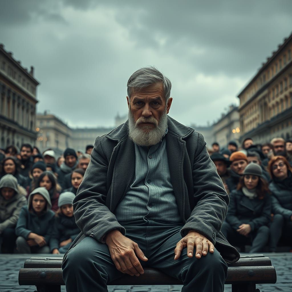 A digital matte painting of a despondent, bearded, graying 50-year-old Italian geologist sitting on a bench in a square, surrounded by a crowd under a leaden sky. The image is dramatic and atmospheric.