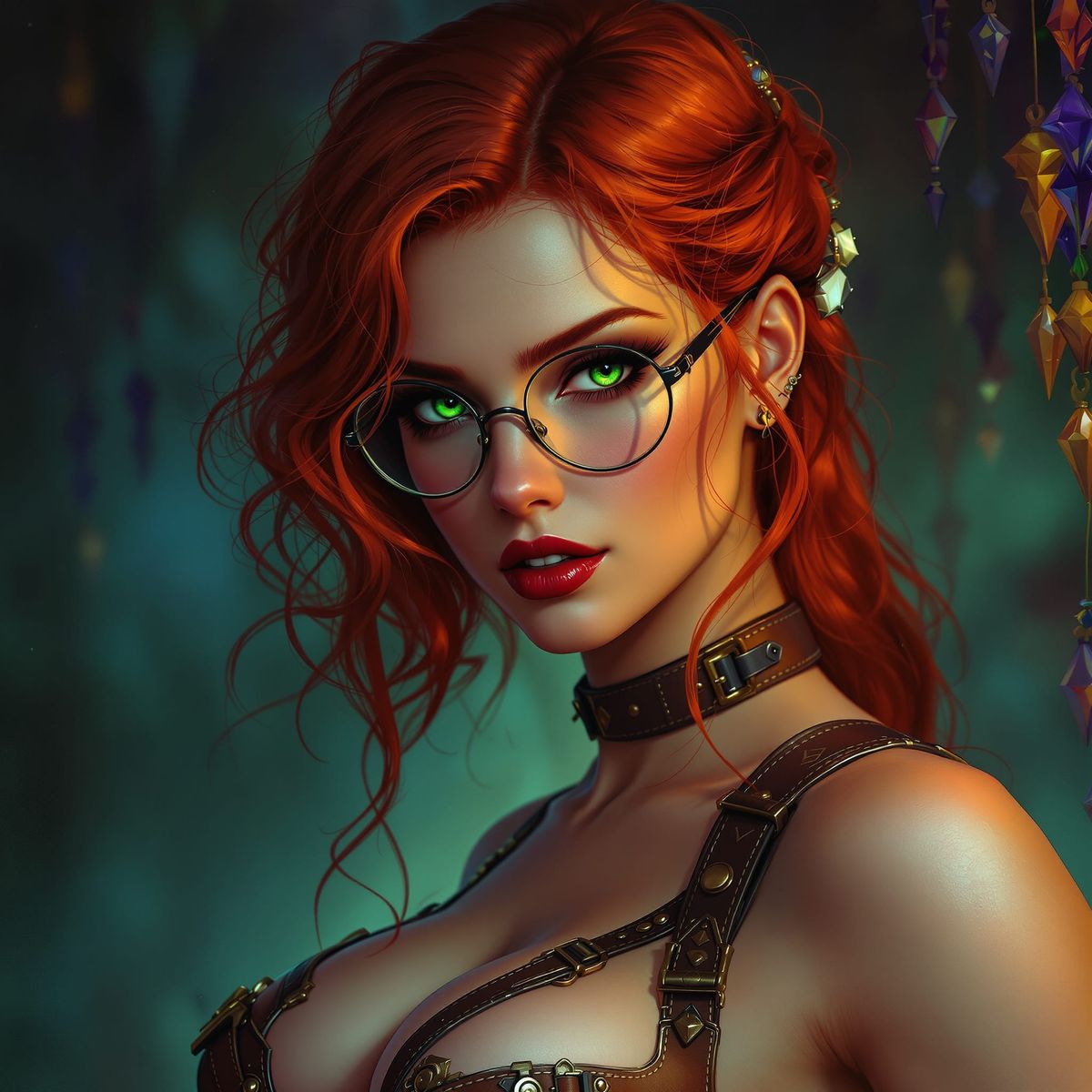 A muscular redhead woman with green eyes and glasses, wearing a detailed leather harness. Rendered in a dark fantasy concept art style with rich colors and dramatic lighting.