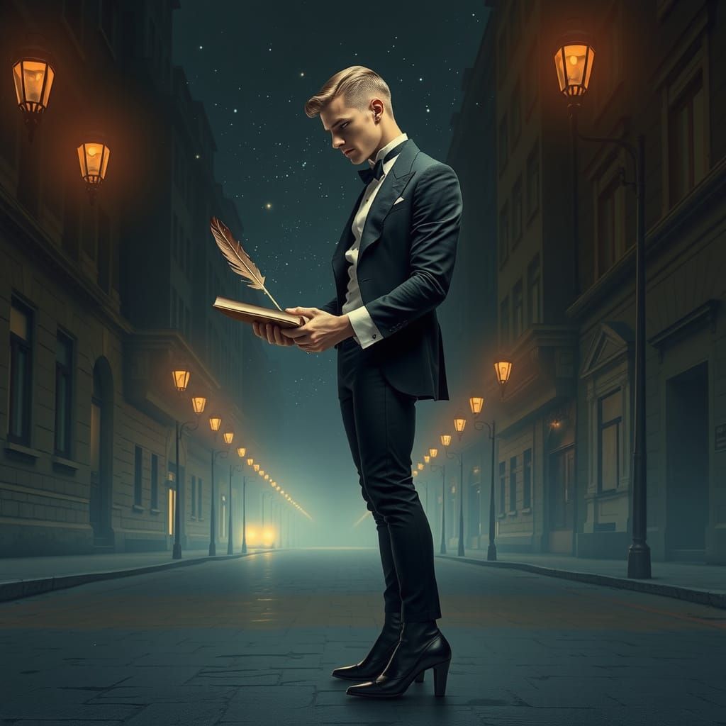 A poignant image of a man standing in a desolate street, illuminated by soft light and starlight, lost in thought as he writes with a quill, set against a dramatic, atmospheric backdrop reminiscent of classic art and literature