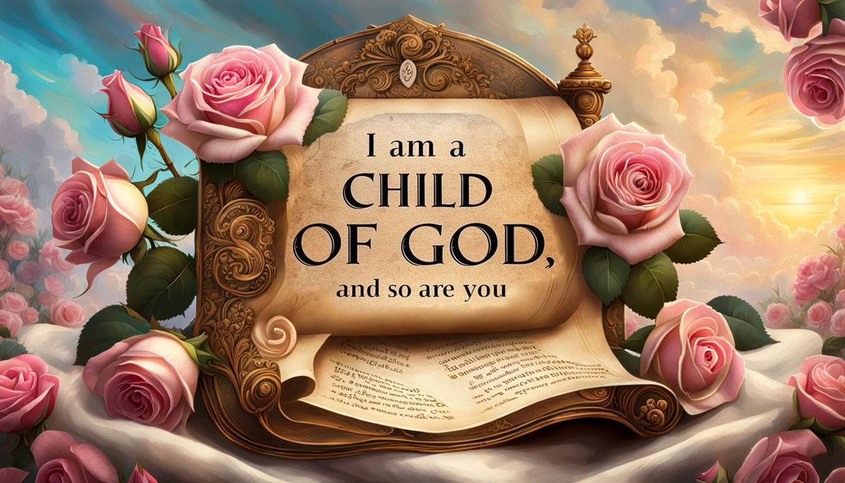 This image shows a vintage scroll with a message about faith, set against a backdrop of pastel roses. The artwork is a digital matte painting with intricate details and dramatic lighting, reminiscent of Art Nouveau.
