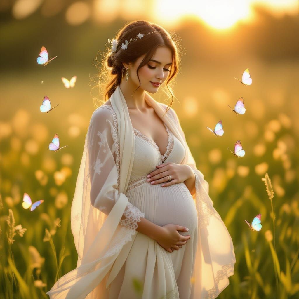 This image shows a serene woman in a flowing dress standing in a sunlit meadow. Butterflies flutter around her, bathed in warm light and soft focus in an Art Nouveau style.