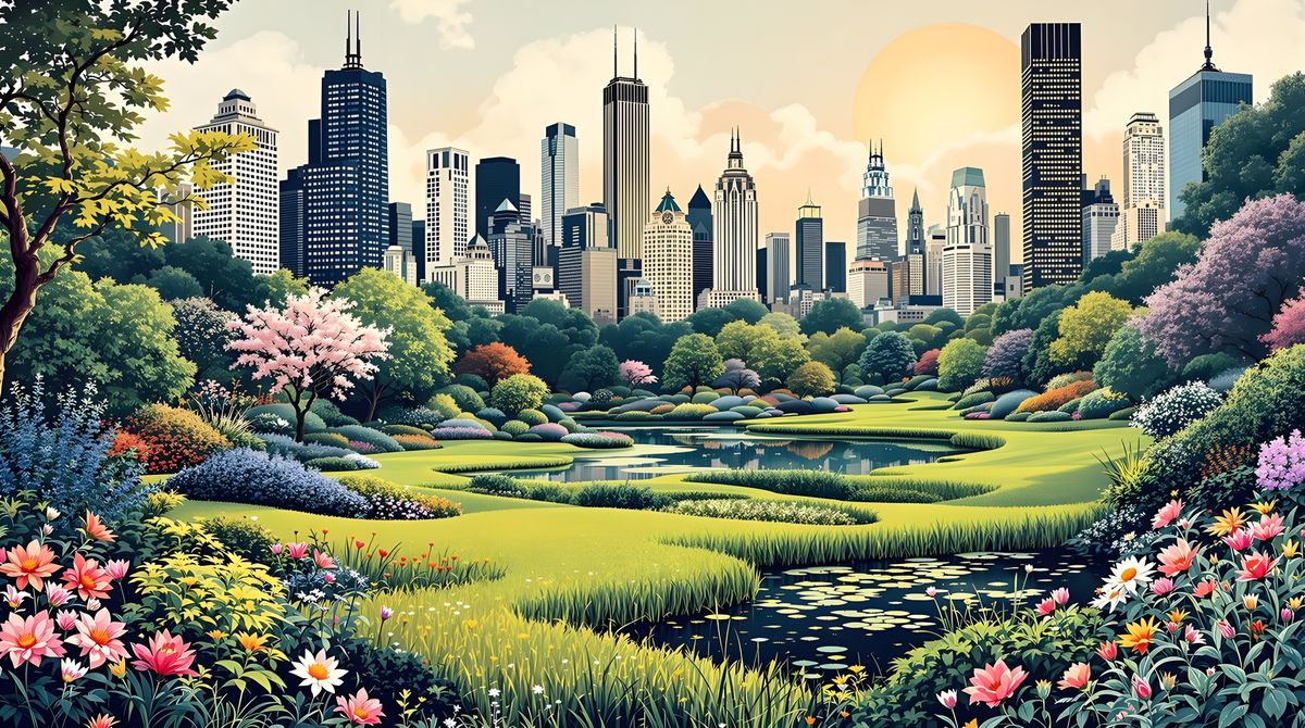 This image is a serene representation of a hidden urban garden, blending the modern city of Chicago with the timeless beauty of ancient Japanese ink painting, featuring a mystical meadow and kaleidoscopic colors.